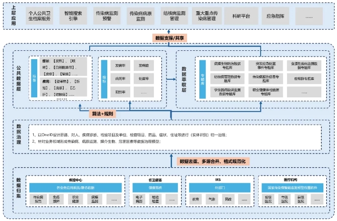 一是构建公共卫生领域多源异构数据归集体系。依托公共卫生大数据平台,与外部系统建立长期、有效的良性合作机制,汇聚离散的个人健康数据,打破信息孤岛困局。主要包括全省公立医疗机构与基层医疗卫生机构的电子病历、处方、检验检查等诊疗记录;涵盖传染病、慢性病、免疫规划、职业健康、学生健康、食品安全等领域的公共卫生监测数据;以及教育、气象、地理信息、舆情等跨部门协同数据。
