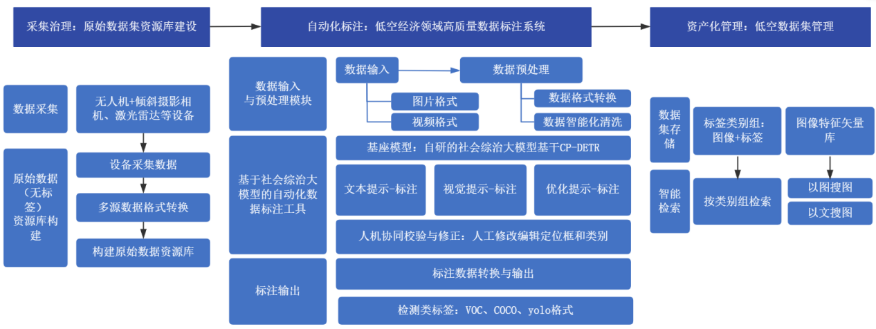 随着低空经济快速发展,无人机巡检、智慧安防、生态监测等场景对高质量数据集的需求日益迫切。当前低空经济行业面临三大核心挑战:数据资源匮乏、行业标准尚未统一、标注效率亟待提升,严重制约AI模型应用效果。本项目构建“采集-标注-管理”全链条闭环体系,通过整合多源低空数据,研发智能标注技术,打造低空经济领域高质量数据集,为低空经济智能化发展提供关键数据支撑。