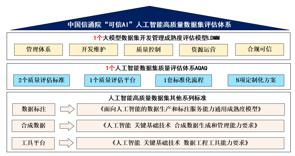 中国信息通信研究院(简称“中国信通院”)人工智能研究所长期深耕人工智能高质量数据集相关技术与标准体系研究,现依托工信部人工智能标准化技术委员会WG2数据工作组,研究建立了“1+1+N”人工智能高质量数据集标准评估体系:构建大模型数据集开发管理成熟度评估模型LDMM,迭代发布人工智能数据集质量评估体系ADAQ2.0版本,研究形成数据采集融合、数据标注、合成数据、数据工程工具平台、模数反馈、全模态数据集、数据集资产入表、数据合规等多项人工智能高质量数据集系列标准。
