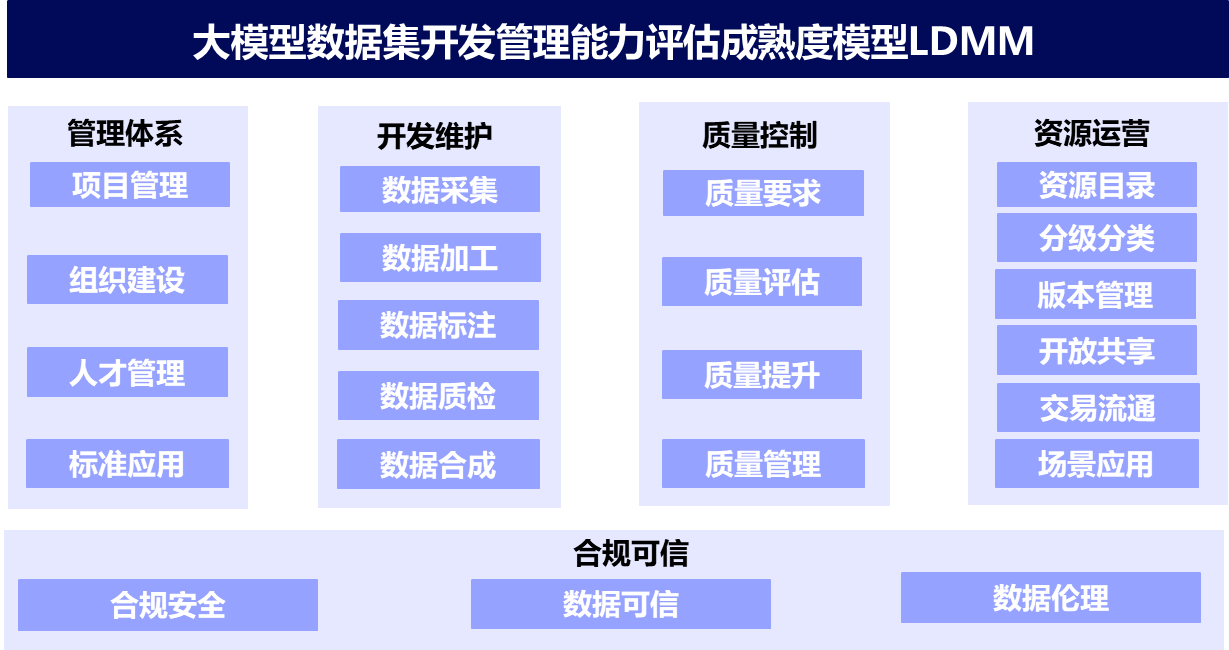 中国信通院人工智能研究所牵头编制形成《大模型数据集开发管理能力分级及评估方法》行业标准(2024-1315T-YD),建立企业大模型数据集开发管理能力成熟度评估模型体系LDMM,旨在面向人工智能数据集拥有方、大模型厂商以及人工智能数据服务方提供大模型数据集开发管理能力构建与评价的标准规范和依据,具体包括管理体系、开发维护、质量控制、资源运营和风险管理共五大组成部分,并将企业大模型数据集开发管理能力划分为5个等级。