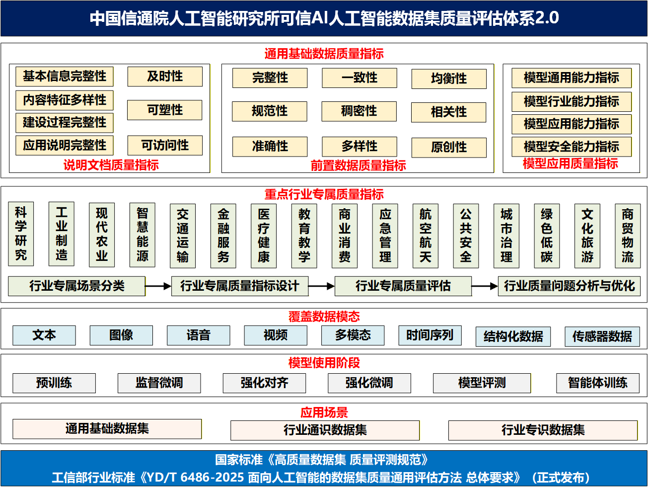 中国信通院人工智能研究所核心支撑编制国家标准《高质量数据集 质量评测规范》,并牵头编制发布人工智能行业标准《面向人工智能的数据集质量通用评估方法 总体要求》(YD/T 6486-2025,已正式发布),搭建“2个质量评估标准+1个质量评估平台+1套标准化流程+N项定制化评估方案”的人工智能数据集质量评估能力,迭代人工智能数据集质量评估工具平台2.0,设计开发100余个人工智能数据质量工程量化算子,涵盖说明文档指标、前置数据集质量指标和模型应用效果指标三大部分,具体包含完整性、规范性、准确性、相关性、及时性等17个一级指标和50余个二级指标,面向通用基础数据集、行业通识类数据集和行业专用类数据集等三大类数据集提供标准化数据集质量评估测试服务。