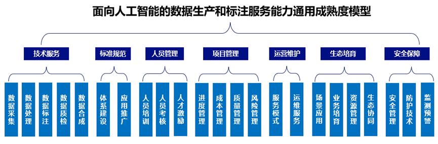 《面向人工智能的数据生产和标注服务能力通用成熟度模型》:旨在面向人工智能数据服务企业和数据标注基地评估人工智能高质量数据集生产和标注服务能力水平,具体包括技术服务、标准规范、人员管理、项目管理、运营维护、生态培育、安全保障等七大能力域。