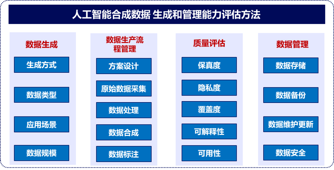 《人工智能 关键基础技术 合成数据生成和管理能力要求》:旨在面向人工智能数据服务企业、大模型企业以及行业企业评估人工智能合成数据的生产和管理能力水平,具体包括人工智能合成数据的生成方式、生产流程、质量评估以及数据管理等四大能力域。