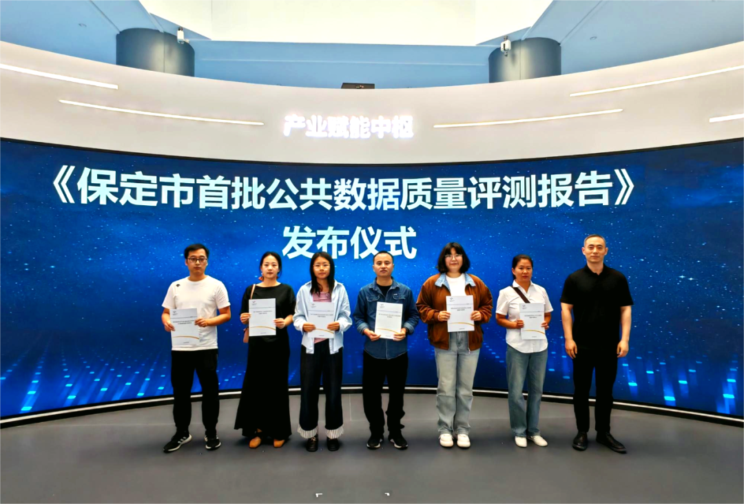在成果发布环节,中心正式发布《保定市首批公共数据质量评测报告》。保定市数据局副局长杨磊为首批通过测评的单位颁发了报告,涵盖保定高新区、顺平县、清苑区、阜平县及高阳县的多家企事业单位。此次成果发布标志着保定市在公共数据质量评测与应用推广方面取得实质性进展,体现了中心在数据评测及治理体系建设中的关键支撑作用。
